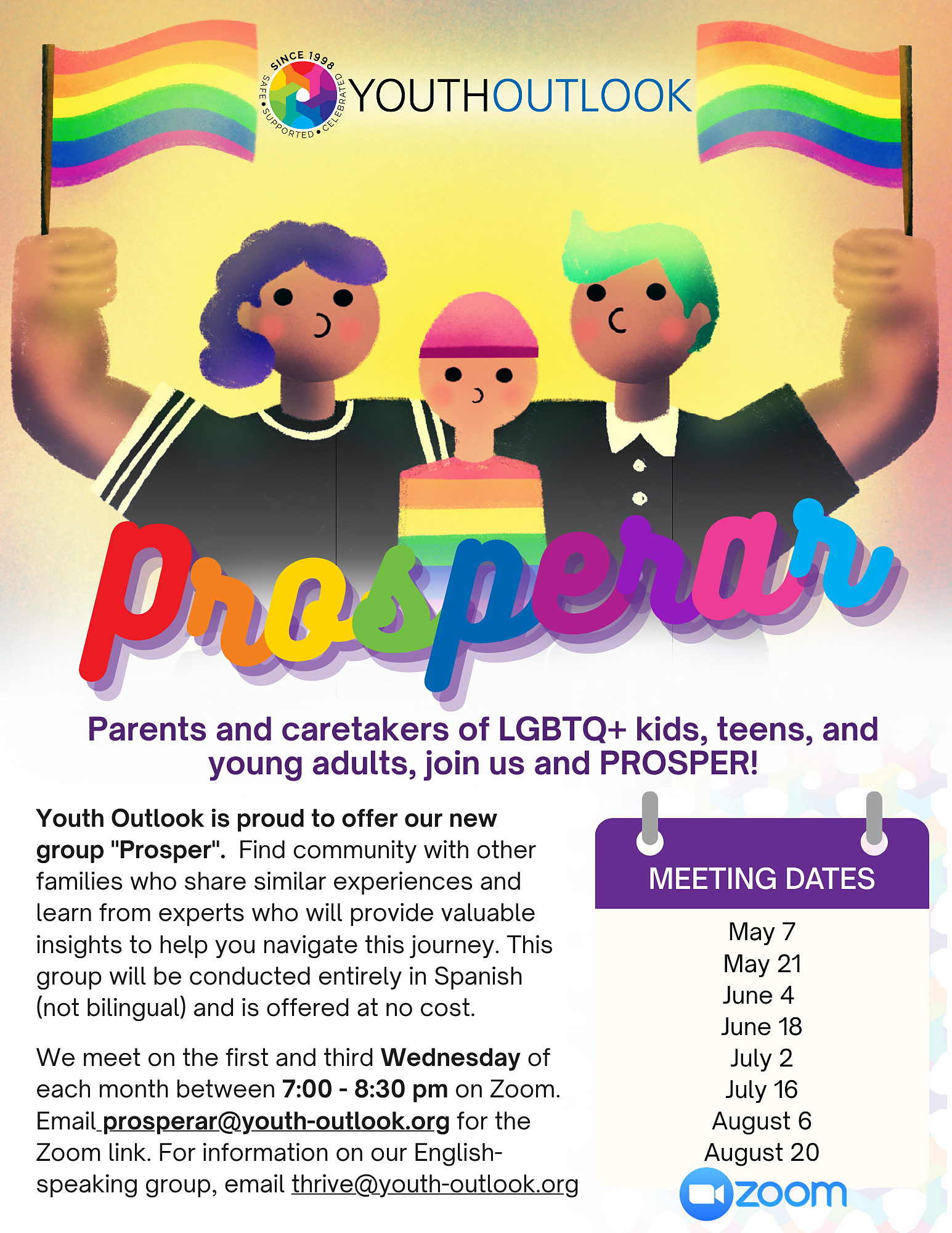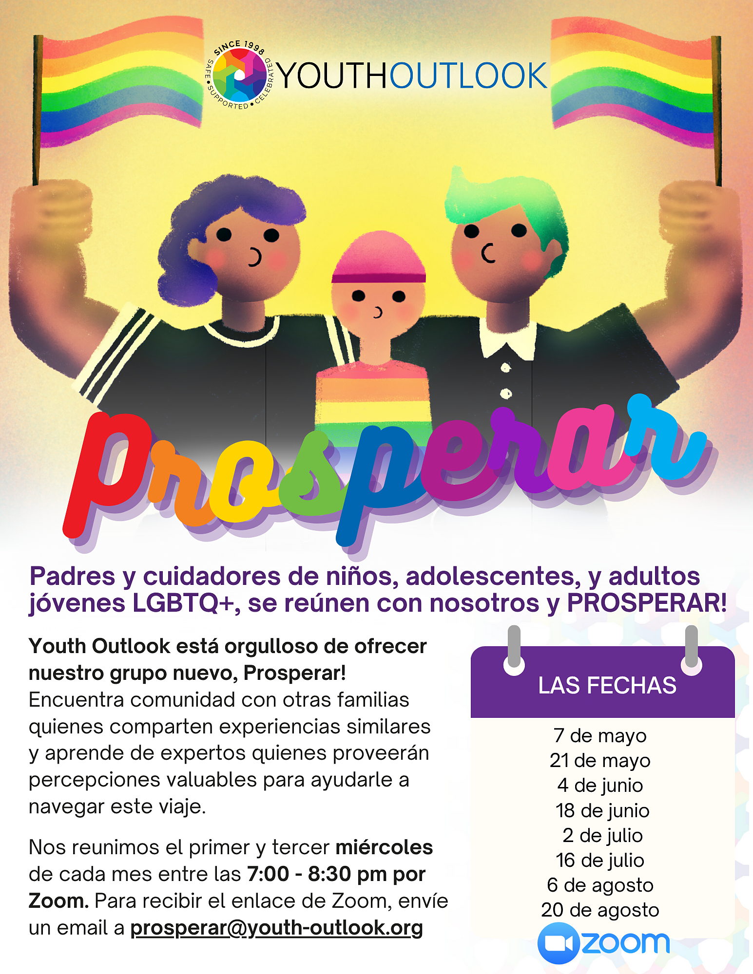 EN: Youth Outlook is proud to offer our new parent and caregiver group, Prosperar, for parents and families of LGBTQ+ youth. Find community with other families who share similar experiences and learn from experts who will provide valuable insights to help you navigate this journey. This group will be conducted entirely in Spanish (not bilingual) and is offered at no cost.