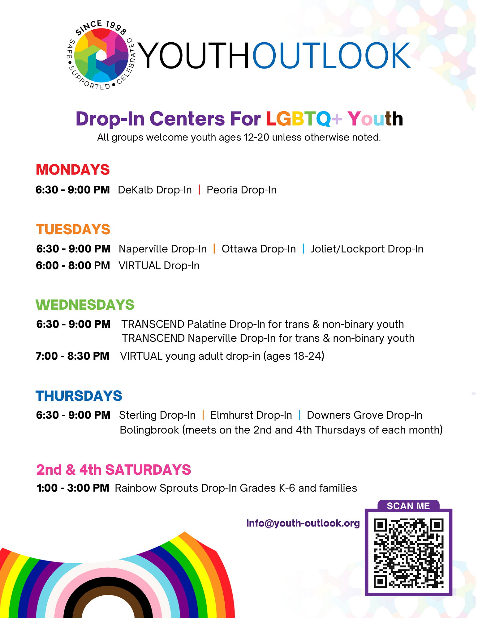 Established in 1998, Youth Outlook is Illinois' first and longest-running nonprofit social services agency, solely dedicated to providing the care and community LGBTQ+ youth need to reach their full potential. Our services are offered statewide, including virtual and in-person drop-in centers for youth ages 5–20, caregiver and parent support, health and wellness navigation, and community education and professional development.