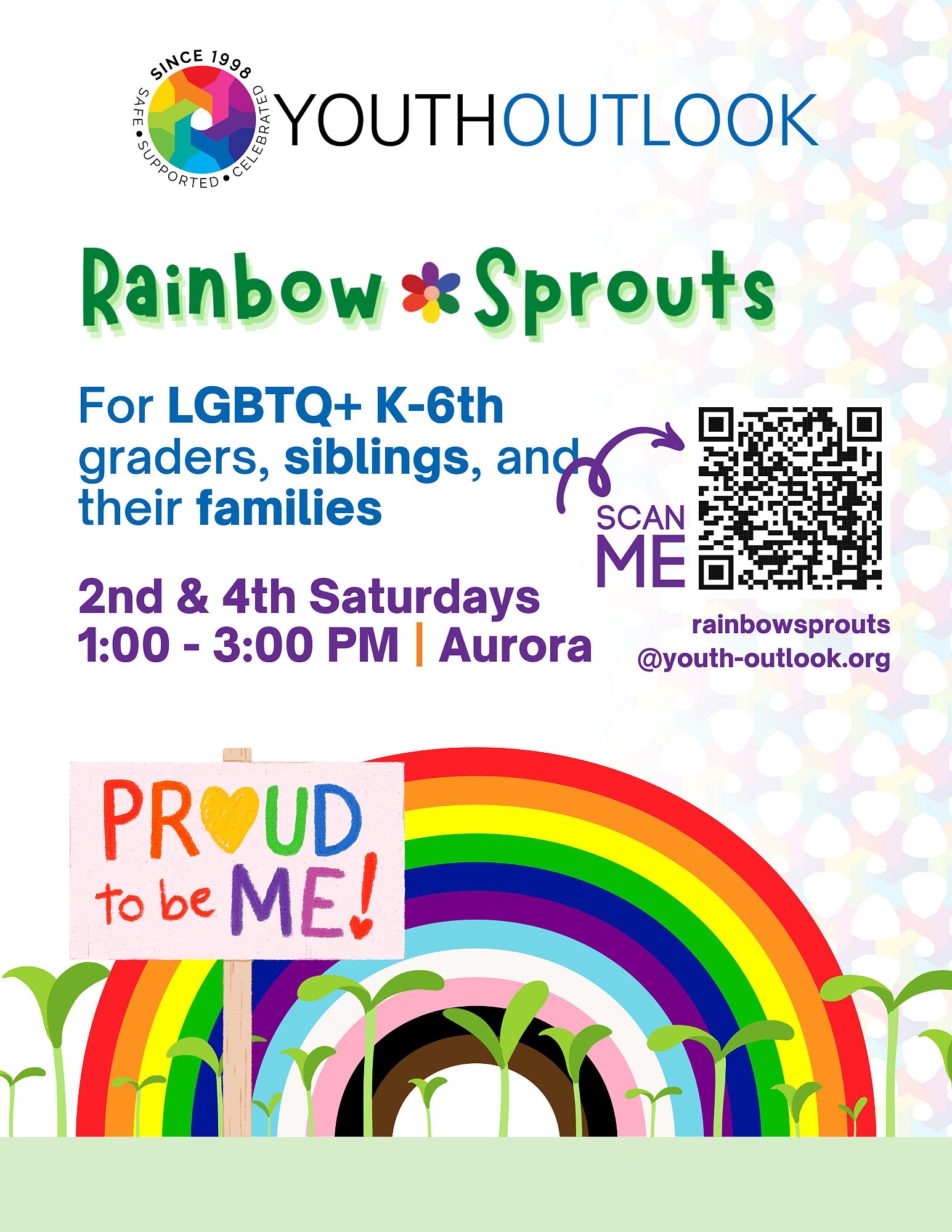 Rainbow Sprouts is for LGBTQ+ youth in grades K–6 and their caregivers and families. We meet the 2nd and 4th Saturdays from 1:00–3:00 p.m. in the Naperville/Aurora area.