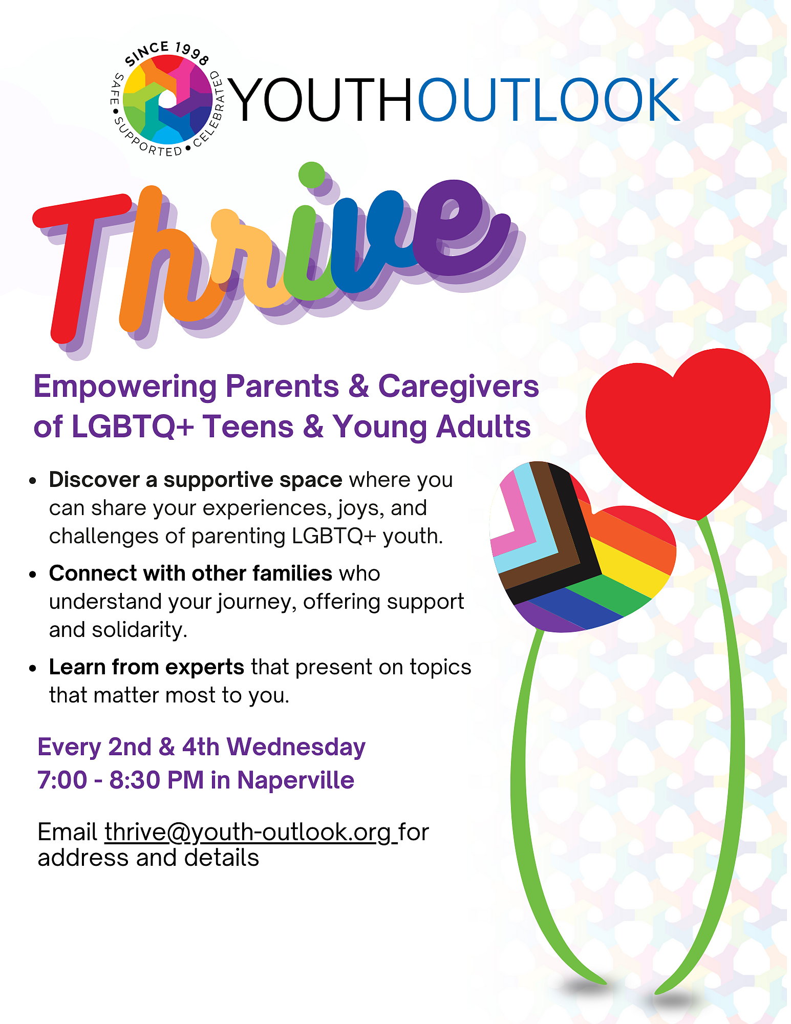 Thrive is open to adult parents and caregivers (we welcome foster parents, guardians, and full-time caregivers) of LGBTQ+ teens and young adults. Grandparents and other relatives have a different role with our kids. We are happy to offer other resources, such as PFLAG, for extended family members. Thrive will be launching in Sycamore in June 2025!